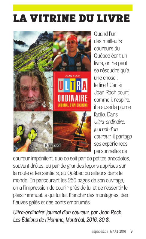 « Quand l’un des meilleurs coureurs du Québec écrit un livre, on ne peut se résoudre qu’à une chose : le lire ! Car si Joan court comme il respire, il a aussi la plume facile. » – Espaces, mars-avril 2016